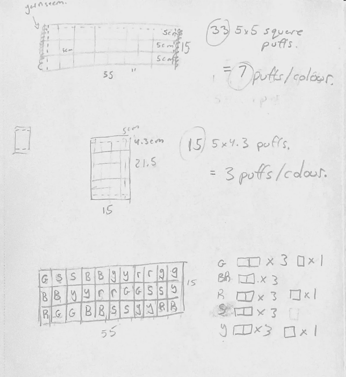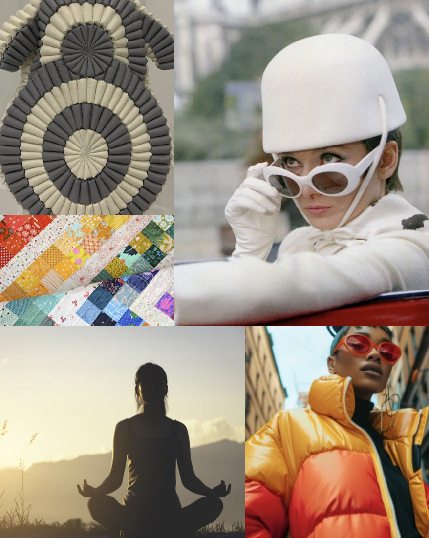 Using a mood board I threaded my observations with current fashion trends—puffer jackets and wellness lifestyle—and my own aesthetic goals—vintage blocky colours and cozy quilts.