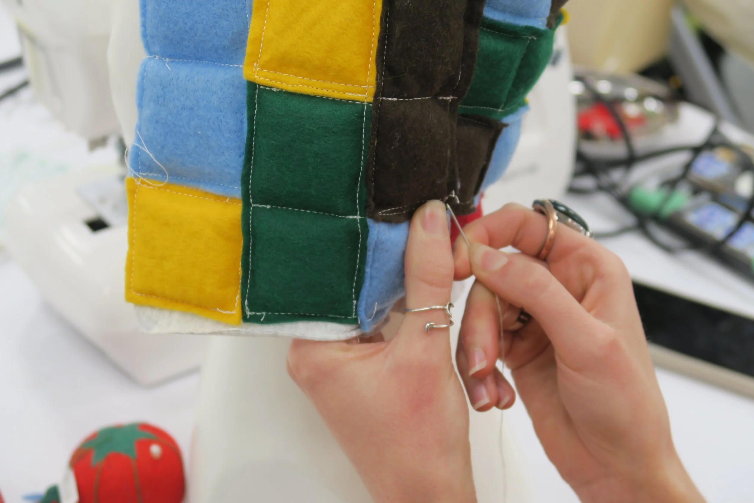 However, due to the intricate material layering, there was a tedious hand-sewing process. In a future iteration, I would reimagine this assembly process.