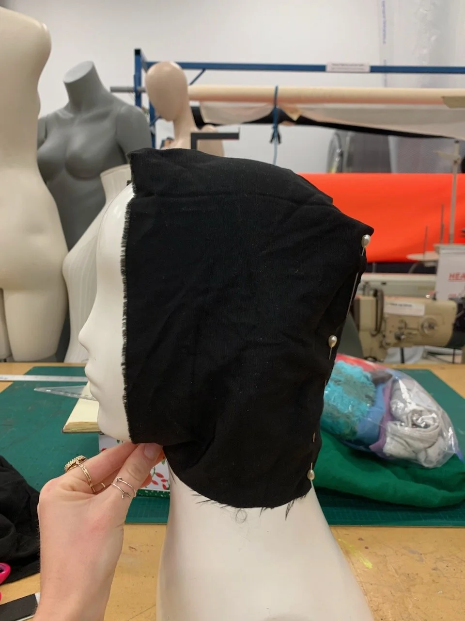I chose a simple bonnet silhouette as it would easily tighten to enhance sensory effects.